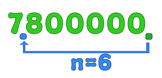 In this example, there is no decimal point at the end of the number, so we will add one. Now, move the decimal point between the digits 7 and 8. Since the decimal is moved six places, we can conclude that n = 6.