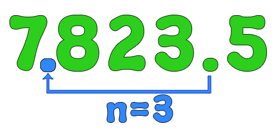 In this example, we need to convert a number, which is greater than 10. To do so move decimal point to the left until you get number lesser than 10. Because the decimal is moved three places, we conclude that n = 3.