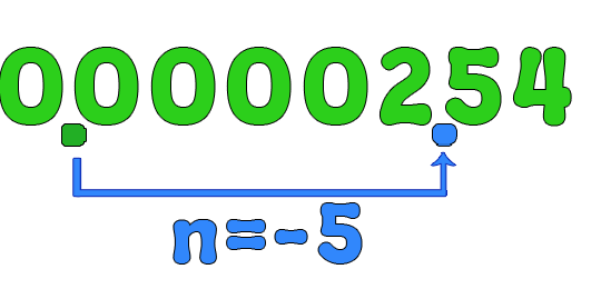 To convert the small number to scientific notation, move the decimal point to the right (between digits 2 and 5). Since the decimal was moved 8 spaces to the right, we might conclude that the n is -8.