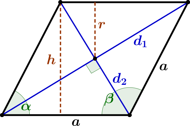 The calculator uses the following formulas to find the missing elements of a rhombus.