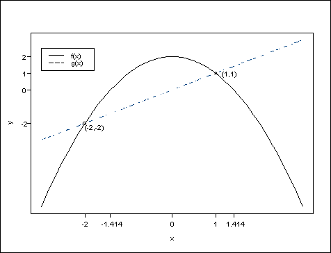 The two lines intersect at the points $(-2, -2)$ and $(1, 1)$ since