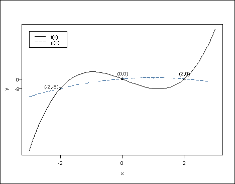 The two lines intersect at the points $( -2, -8)$, $( 0, 0)$ and $( 2, 0)$ since