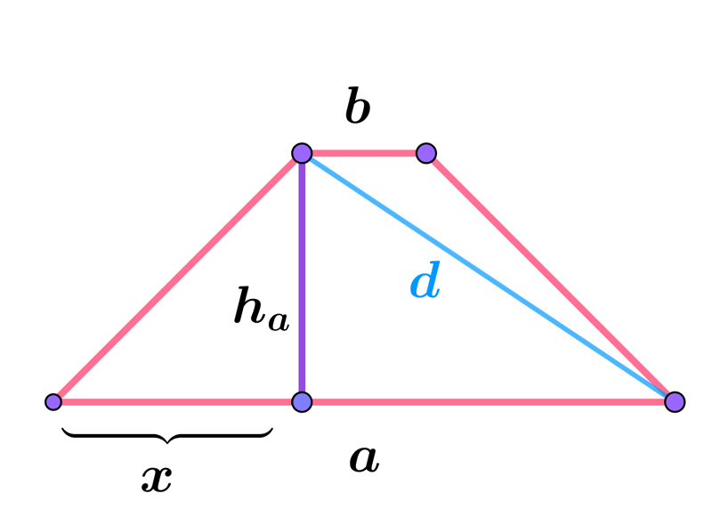 $d = \sqrt{{h_{a}}^{2}-\dfrac{(a-b)}{2}^{2}}$