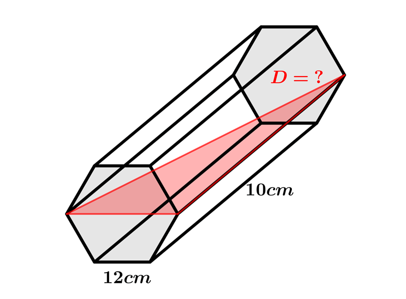 Find the length of missing diagonal of the hexagonal prism shown on the picture (the length of base edges is $12cm,$ and the height is $10cm$).